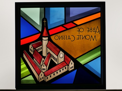 A stained glass window was damaged in a recent fall. Heritage was contacted to provide repairs on a damaged depiction of the famous Italian monastery Monte Cassino.