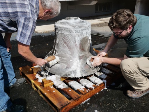 Next, the metal mounting hardware, ball clapper, and hammer were put through a restoration process of their own. Without these components, the bell would have to be manually struck with a mallet to create a sound. Each piece is cleaned and scrubbed to remove dirt and debris that have built up over time. These components are nowhere near as tarnished as the bell’s main body, and are coated after the cleaning is completed.
