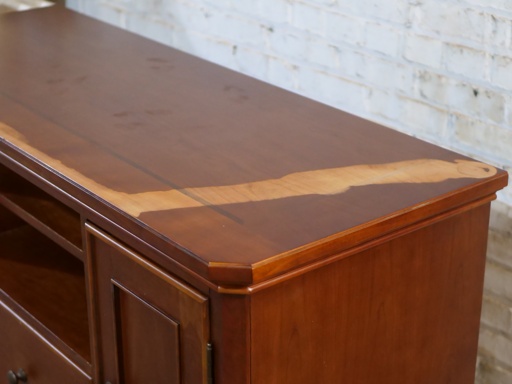 During some household cleaning, a furniture polish had eaten through a noticeable portion of this television cabinet top’s finish. Heritage Restoration took the cabinet and put it through a refinishing process. The remainder of the tabletop was cleared to create a uniform surface. This surface was then coated, in a process called staining, with the correct hue of brown. Afterwards, a protective coating known as a finish was applied on top of the stain. Finishes not only create a protective layer between the stain and the atmosphere, but they also increases the luster of the wood. After drying for twenty-four hours, the restored cabinet was delivered back to its owner.