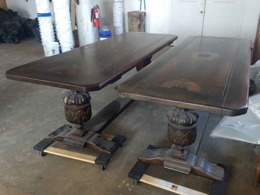 The first step in a process like this is to remove the existing finish coating. Doing so allows the woodworkers access to the real surface of the table. Chemical agents were carefully applied over the finish, which soon dissolved. Afterwards, both tables underwent repairs. Chips and dents in the surface were filled, and the large gouges in the legs were replaced with carved wood. This process took several days crafting both by hand and by machine in order to make sure the replacements matched the broken filigree.