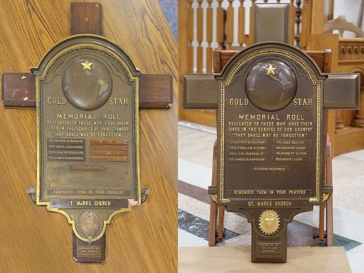 Once the plaque and backer board were attached, the memorial was brought into Heritage’s refinishing room to be painted. A rich, chocolate brown was decided to be the base color. It is most important to vibrantly highlight the detail work in these type of projects. As such, gold leaf was painstakingly applied to each character, border, and emblem. The sharp contrast between the brown and gold colors effortlessly brings the details to the forefront for those viewing the memorial. After the appropriate curing time was completed, the client received their newly restored plaque. Once it is displayed, the parish will once again be paying tribute to those who gave their lives in the war eighty years ago.